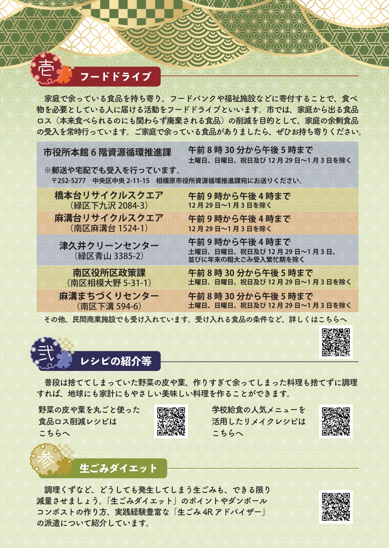 相模原市では、家庭で余っている食品を持ち寄り、フードバンクや福祉施設などに寄付することで、食べ物を必要としている人に届ける「フードドライブ」、普段なら捨ててしまう野菜の皮や葉を丸ごと使った「レシピの公開」、調理くず等どうしても発生してしまう生ごみもできるだけ減量ための「生ごみダイエット」等、様々な取組みを行っております。詳しくは市HPをご覧ください。